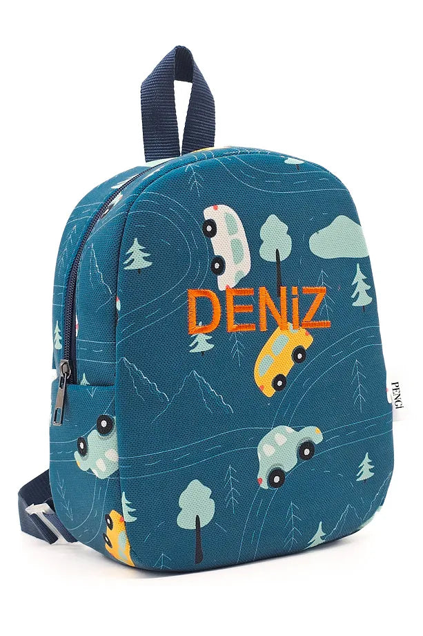 Lightweight kids' nursery backpack with cars. Perfect for preschool. This bag can be personalized with your child's name embroidered on the front — included in the price. secure delivery available.